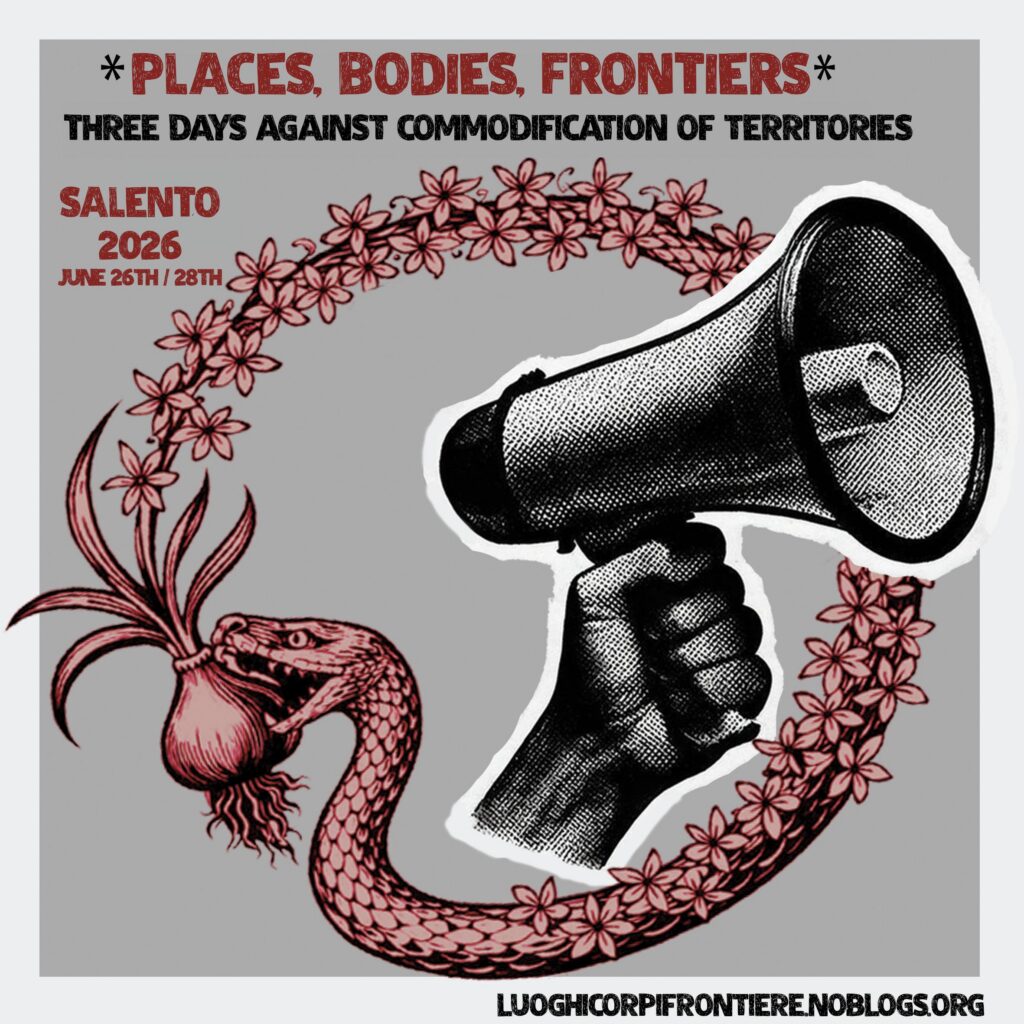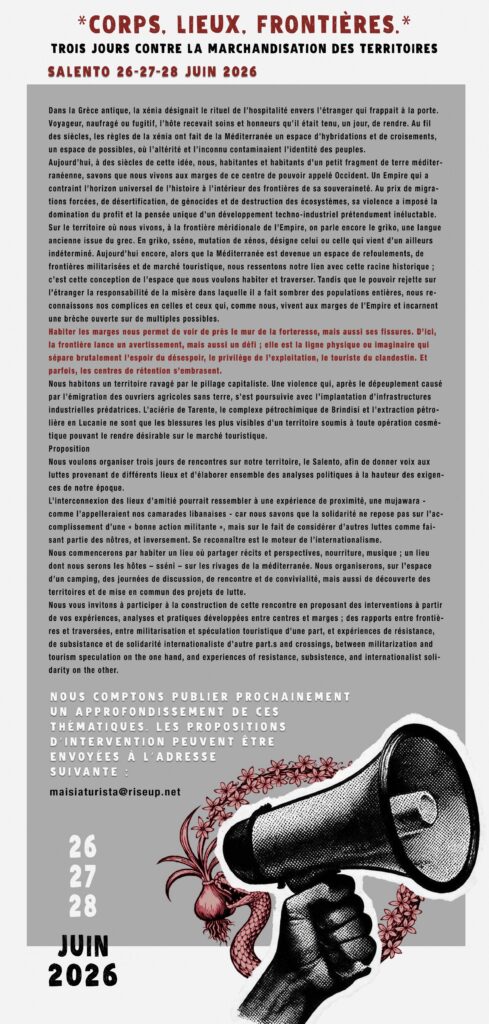 Nous voulons organiser trois jours de rencontres sur notre territoire, le Salento, afin de donner voix aux luttes provenant de différents lieux et d’élaborer ensemble des analyses politiques à la hauteur des exigences de notre époque.